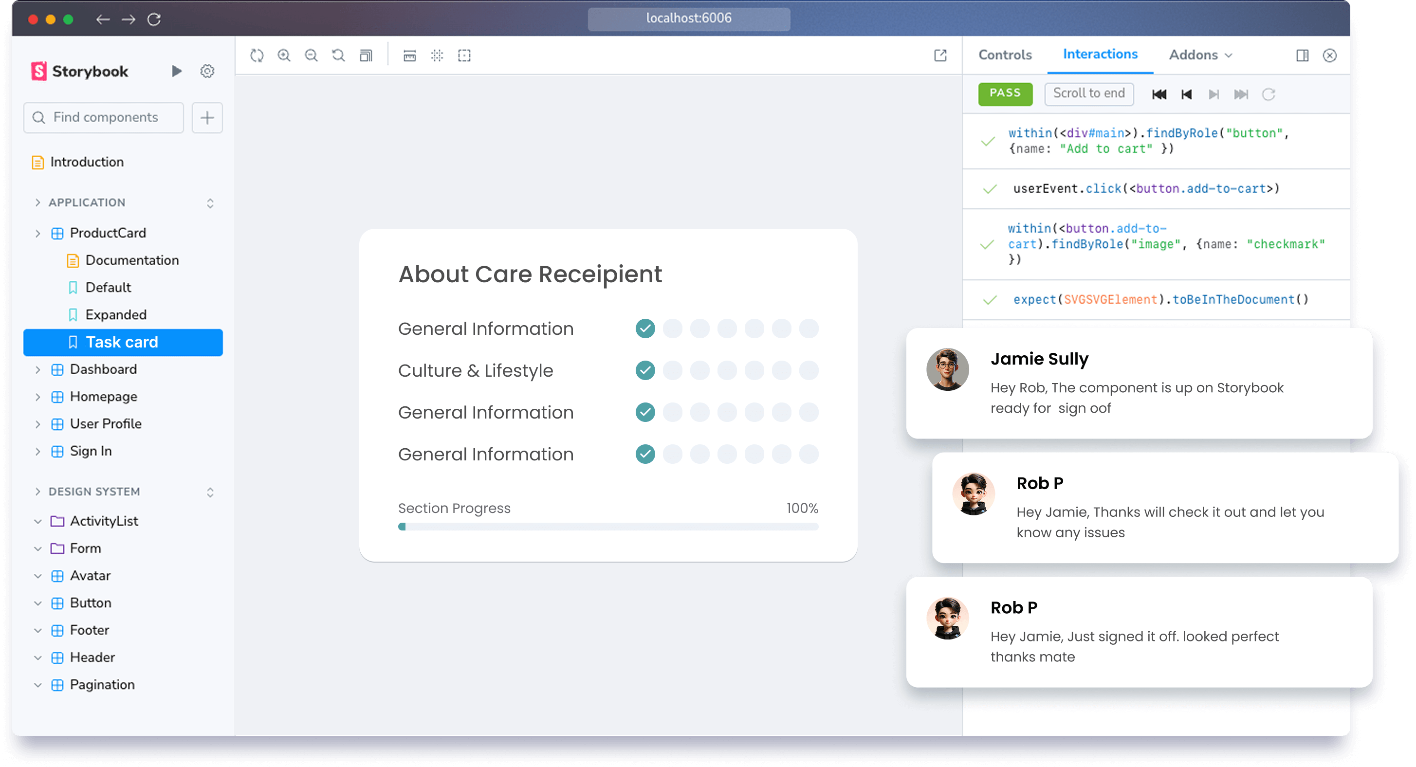 We connected the design system to storybook so when the engineer Jamie had done building components I could compare and sign off .This was great because this way we could make sure the design and build were a 100% match..