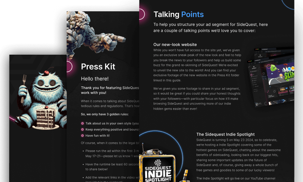 Side Launch is the developer side of SideQuest. This area is a story themed way to make the app listing process more fun but more importantly a much easier way to create a listing